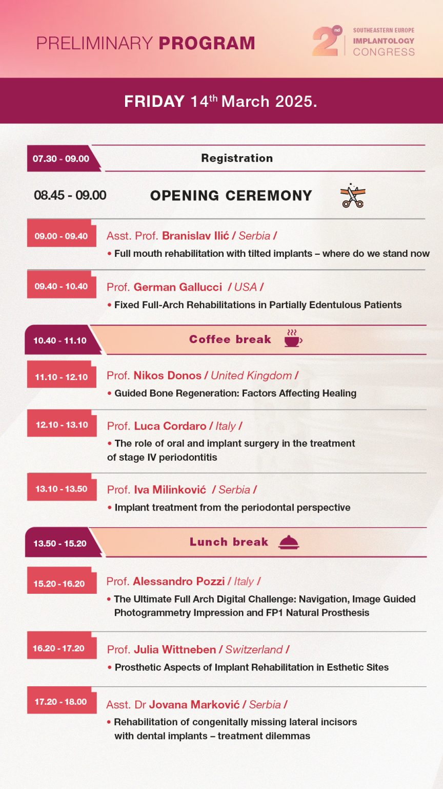 We will keep you informed on all relevant information related to your participation, including the preliminary program which will be available in September, through the 2nd SOUTHEASTERN EUROPE IMPLANTOLOGY CONGRESS Belgrade DENTI 25 Website which will be launched in a few weeks, via regular promotional campaigns and our social networks.